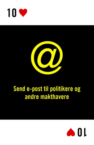 Påvirkningsarbeid kan blant annet bestå i å sende e-poster direkte til politikere. Legg ved Amnesty International Norge sine krav og dokumentasjon, for eksempel vår siste rapport om temaet eller en høringsuttalelse. Send til dine lokale stortingspolitikere, fylkes- eller lokalpolitikere. Adresser ligger gjerne på hjemmesiden eller man får dem ved å kontakte administrasjon.